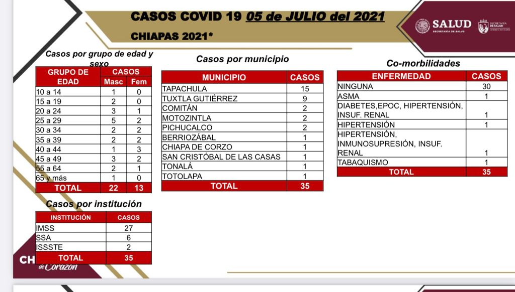 Tuxtla Gutiérrez, Chiapas; 05 de julio de 2021.- La entidad chiapaneca comienza la semana número 21 en semáforo verde con el registro de 35 casos nuevos de COVID-19 en 10 municipios, además de una defunción en una persona adulta mayor.