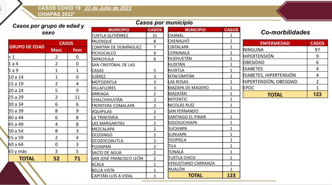 Tuxtla Gutiérrez, Chiapas; 23 de julio de 2022.- La Secretaría de Salud de Chiapas informa que en las últimas horas se registraron 123 casos nuevos de COVID-19, de acuerdo con las pruebas analizadas por el Laboratorio Estatal de Salud Pública, sin defunciones; la mayor parte de los contagios se presentó en personas de 20 a 54 años de edad.