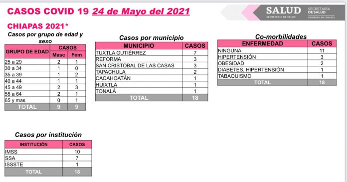 Tuxtla Gutiérrez, Chiapas; 24 de mayo de 2021.- Chiapas inicia la semana número 15 en semáforo verde con la confirmación de 18 casos de COVID-19, incidencia que se concentró en siete municipios de la entidad.