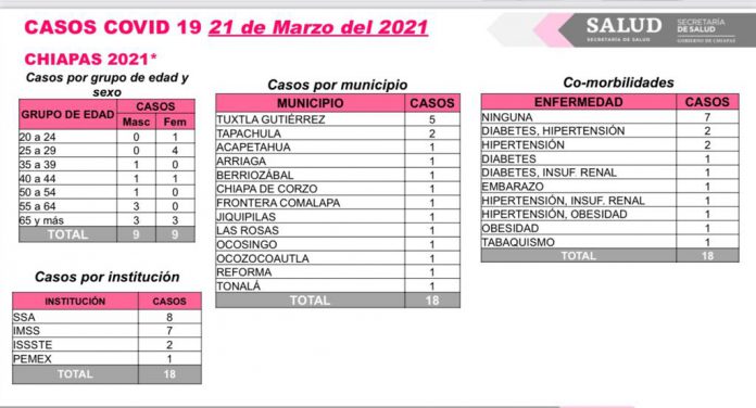Tuxtla Gutiérrez, Chiapas; 21 de marzo de 2021.- El informe diario de casos de COVID-19 indica que en las últimas horas se reportaron 18 contagios en la entidad, la mayoría de los pacientes positivos con enfermedades adicionales.