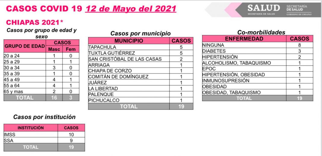 Tuxtla Gutiérrez, Chiapas; 12 de mayo de 2021.- En las últimas horas, 10 municipios del estado concentraron la incidencia de casos de COVID-19, con 19 contagios reportados, comunica la Secretaría de Salud de Chiapas.