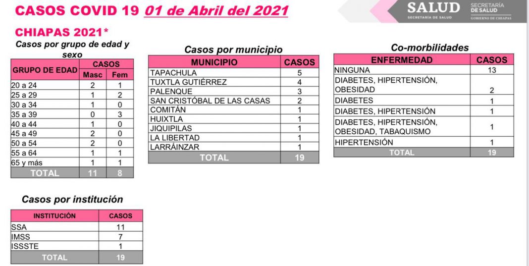 Tuxtla Gutiérrez, Chiapas; 01 de abril de 2021.- El Laboratorio Estatal de Salud Pública confirmó 19 casos de COVID-19 en las últimas horas, de los cuales solamente seis pacientes presentan enfermedades adicionales.