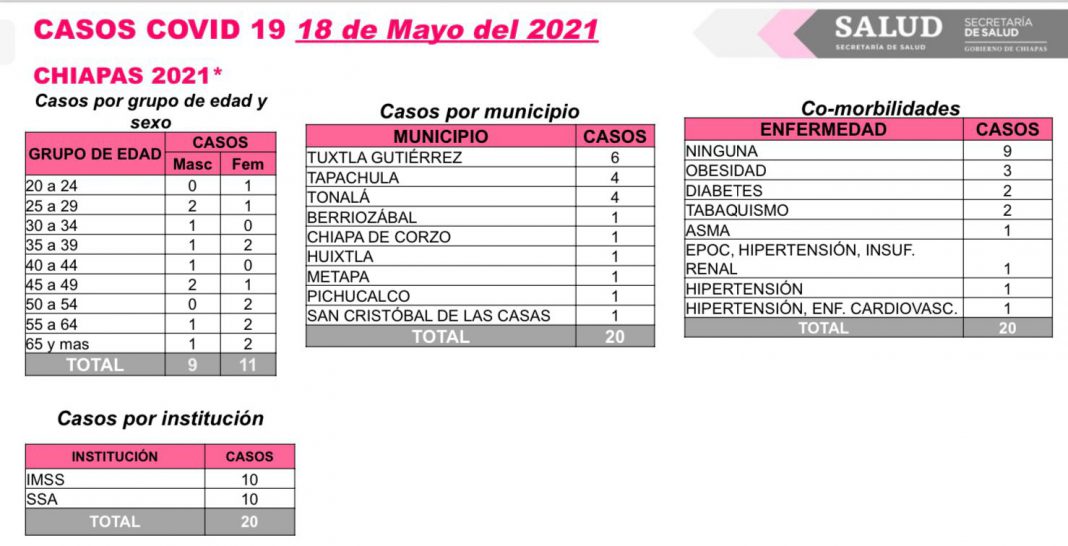 Tuxtla Gutiérrez, Chiapas; 18 de mayo de 2021.- La Secretaría de Salud de Chiapas comunica que en las últimas horas se reportaron 20 casos nuevos en pacientes mayores de 20 años de edad, así como un deceso en una persona adulta mayor.