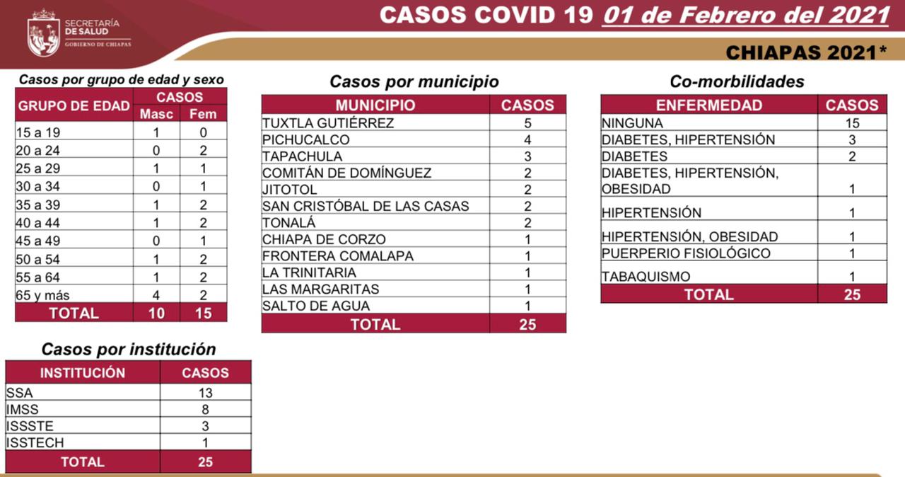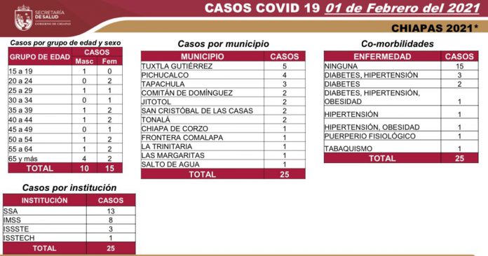 Tuxtla Gutiérrez, Chiapas; 1 de febrero de 2021.- La Secretaría de Salud del estado informa que en las últimas horas se confirmaron 25 casos de COVID-19, así como cinco fallecimientos por esta enfermedad.
