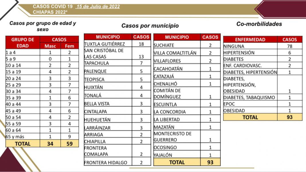 Tuxtla Gutiérrez, Chiapas; 15 de julio del 2022.- La Secretaría de Salud del estado informó que se registraron 93 casos nuevos de COVID-19 en las últimas 24 horas, en 29 municipios: Tuxtla Gutiérrez (18), San Cristóbal de Las Casas (13), Tapachula (7), Palenque (5), Teopisca (5), Huixtán (4), Tonalá (4), Bella Vista (3), Cintalapa (3), Huehuetán (3), Larráinzar (3), Arriaga (2), Chiapilla (2), Frontera Comalapa (2), Frontera Hidalgo (2), Suchiate (2), Villa Comaltitlán (2), Villaflores (2), Cacahoatán (1), Catazajá (1), Chenalhó (1), Comitán (1), Escuintla (1), La Concordia (1), La Libertad (1), Mazatán (1), Montecristo de Guerrero (1), Ocosingo (1) y Yajalón (1); sin registro de defunciones por esta enfermedad respiratoria.
