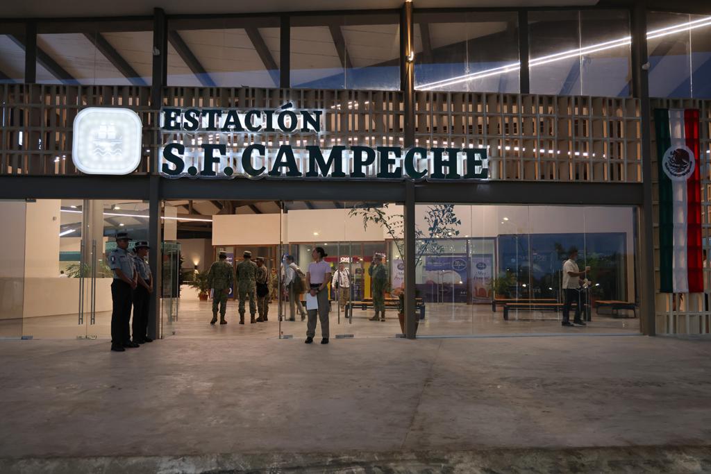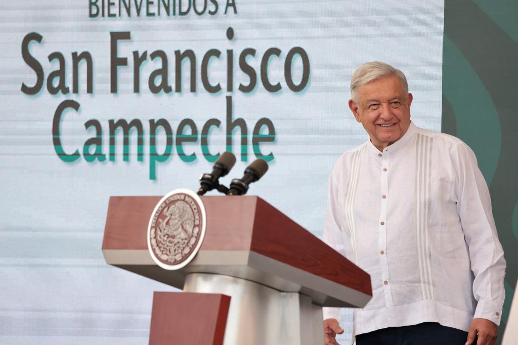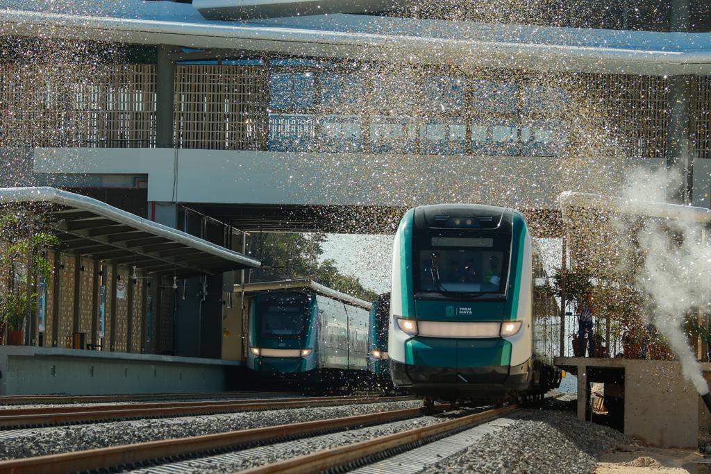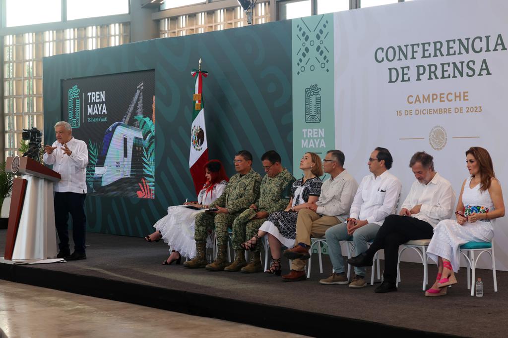 Foto: PresidenciaSan Francisco Campeche, Campeche, México, 15 de diciembre de 2023. Andrés Manuel López Obrador, presidente Constitucional de los Estados Unidos Mexicanos encabeza conferencia de prensa e inicio de operaciones del Tren Maya, tramo Campeche-Cancún en la estación San Francisco Campeche. Lo acompañan Layda Elena Sansores San Román, gobernadora Constitucional del Estado de Campeche; Luis Cresencio Sandoval González, secretario de la Defensa Nacional; David Lozano Águila, director general de la empresa Tren Maya; Guadalupe Phillips Margain, directora general de ICA; Manuel Muñozcano Castro, director general de Azvindi Ferroviario; Antonio Gómez García, director general de Grupo Carso; João Pedro Santos Parreira, presidente de Mota-Engil y Maite Ramos Gómez, directora de Alstom México.