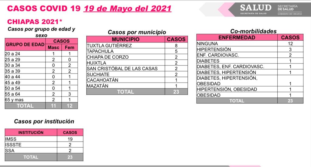 Tuxtla Gutiérrez, Chiapas; 19 de mayo de 2021.- El informe diario sobre la transmisión de COVID-19 en la entidad indica que en las últimas horas se confirmaron 23 casos.