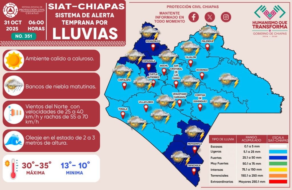 El Sistema de Alerta Temprana por #Lluvias (#SIAT) de #ProtecciónCivil Chiapas emite el pronóstico de lluvias en nuestro estado.