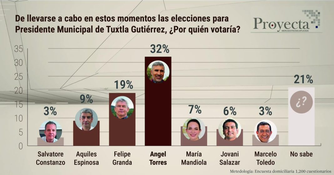 De acuerdo con la más reciente encuesta realizada por la empresa Proyecta Mercadotecnia Aplicada, Angel Torres se mantiene como el candidato preferido por los ciudadanos de la capital chiapaneca para ocupar el cargo de Presidente Municipal.