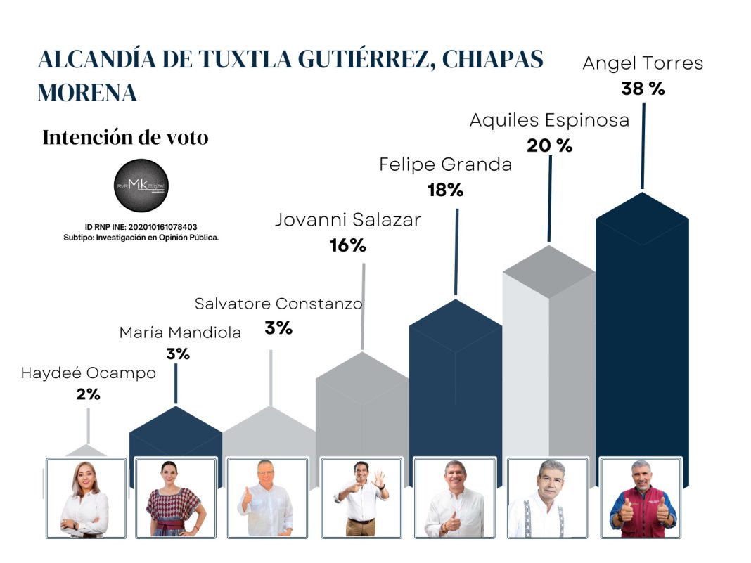 Empresas prestigiosas como “Aperture, Consultoría & Marketing”, “Proyecta Mercadotecnia Aplicada” y “Data Encuestas Chiapas”, entre otras, que cuentan con resultados reales, ubican al morenista Ángel Torres en primer lugar.