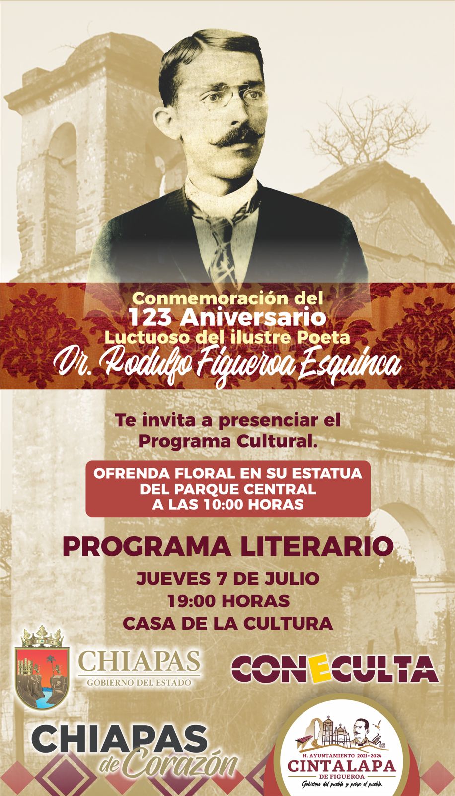 El Ayuntamiento de Cintalapa de Figueroa en coordinación con CONECULTA; te invitan a formar parte de la conmemoración del 123 #Aniversario Luctuoso del ilustre poeta, Dr. Rodulfo Figueroa Esquinca.