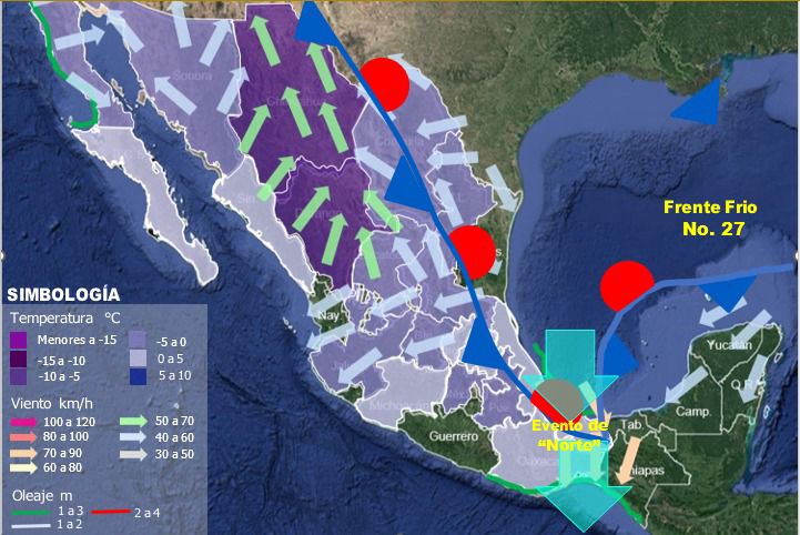 Así mismo, la masa de aire ártico asociada al frente empezará a modificar sus características térmicas en el transcurso del día; sin embargo, mantendrá el evento de “Norte” con rachas de viento de 70 a 90 km/h en Veracruz (sur) e Istmo y Golfo de Tehuantepec, durante la mañana.