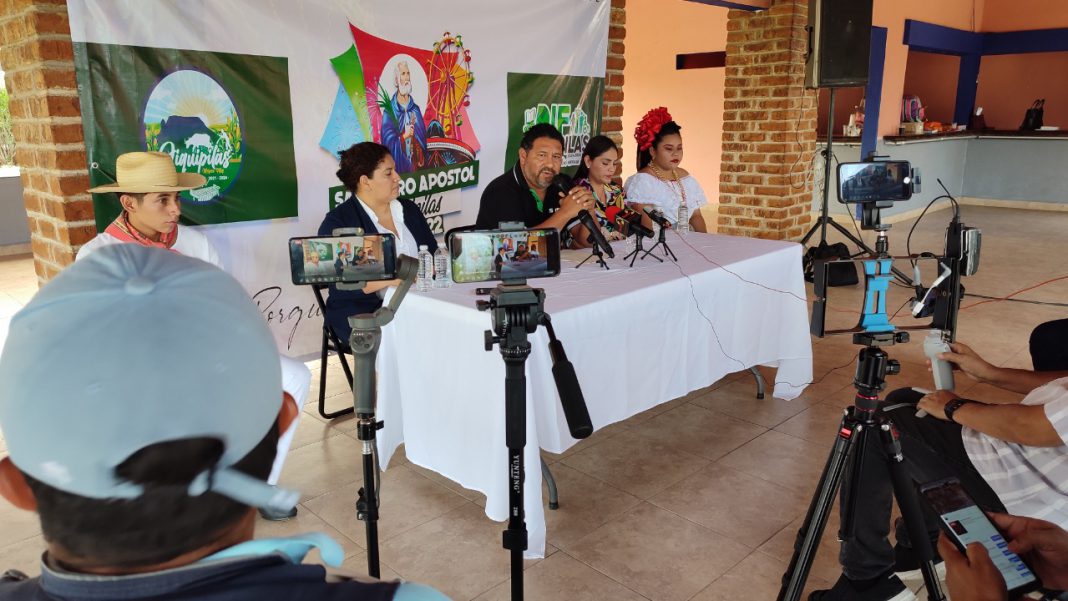 Jiquipilas, Chiapas.- En rueda de prensa, el alcalde César Hugo Lázaro Rodríguez acompañado de su esposa Madely Montejo Maza y los integrantes del Comité, presentaron de manera oficial la cartelera de actividades de la Feria de San Pedro Apóstol 2022, en Jiquipilas.