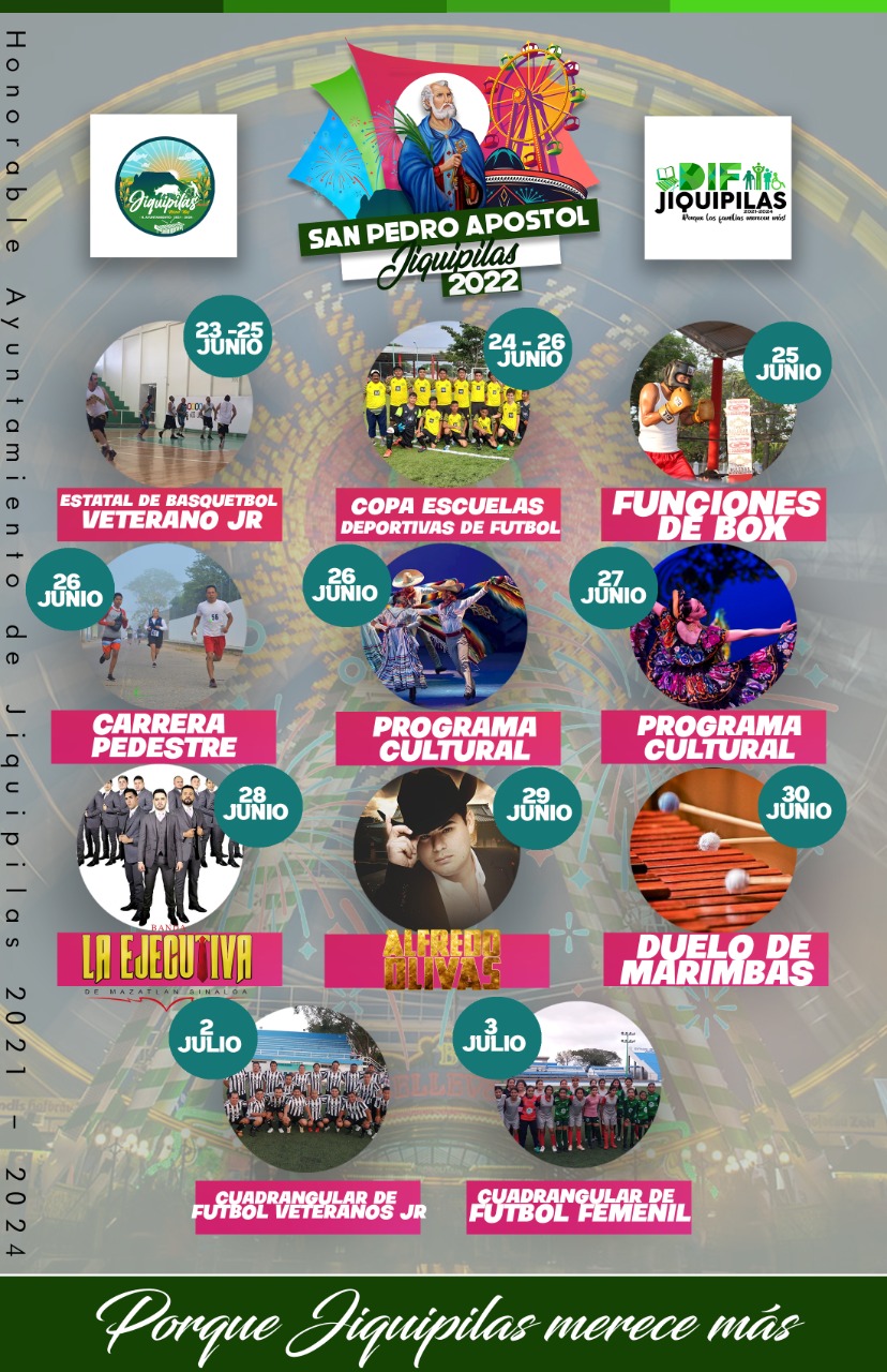 Dentro del marco de la feria, el edil mencionó que se dará inicio del 25 de junio al 3 de julio, donde se disfrutará de eventos deportivos como torneos de fútbol y básquetbol, carrera pedestre, funciones de boxeo; así como programas culturales en el teatro del pueblo y los eventos masivos en la unidad deportiva teniendo como estelares a Alfredo Olivas, Banda la Ejecutiva, grupos los zembers, zona cero y el duelo de marimbas, además del rodeo de media noche con cacho mocho.