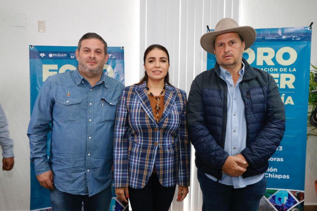 Acompañadas del presidente de la Asociación de Criadores de Razas Puras del Estado de Chiapas, Manuel Espinosa Poo y la representante No Gubernamental del Sistema Productos Bovinos Leche, Consuelo González Pastrana, la titular de la SAGyP, Andrea Gil, explicó que este Foro se realiza por primera vez en nuestra entidad y tiene como objetivo, conocer la importancia del papel de la mujer ganadera en los diferentes ámbitos de la producción pecuaria en México, mediante la participación de mujeres involucradas en empresas, ganaderías, universidades, entre otras actividades, donde se contará con la presencia de la presidenta fundadora de MUGAM, Nanet Molina Lizárraga.