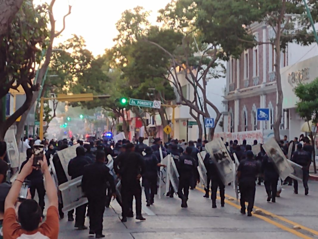 Tuxtla Gutiérrez, Chiapas.- Elementos de la Secretaría de Seguridad y Protección Ciudadana del Estado (SSyPC) aplicaron el Protocolo para Restablecer el Orden en el centro de Tuxtla Gutiérrez, donde un grupo de estudiantes de la Escuela Normal Rural Mactumactzá realizó actos vandálicos en la vía pública y en el Palacio de Gobierno.