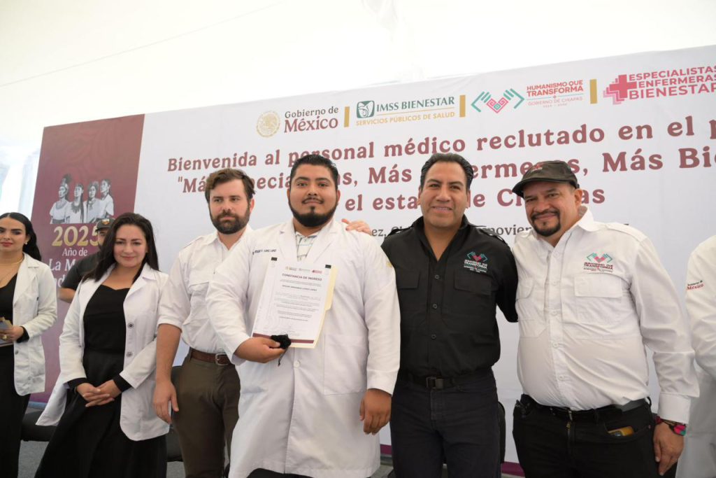 El gobernador Eduardo Ramírez Aguilar, junto al director general de los Servicios Públicos de Salud del IMSS-Bienestar, Alejandro Svarch Pérez, encabezó la bienvenida al personal médico reclutado en el programa Más Especialistas, Más Enfermeras, Más Bienestar. En este marco, subrayó que el gobierno de la Nueva ERA está alineado con la política de salud que impulsa la presidenta de México, Claudia Sheinbaum Pardo, y agradeció que Chiapas es la primera entidad seleccionada para iniciar esta estrategia que fortalecerá los servicios de salud en todo el estado.