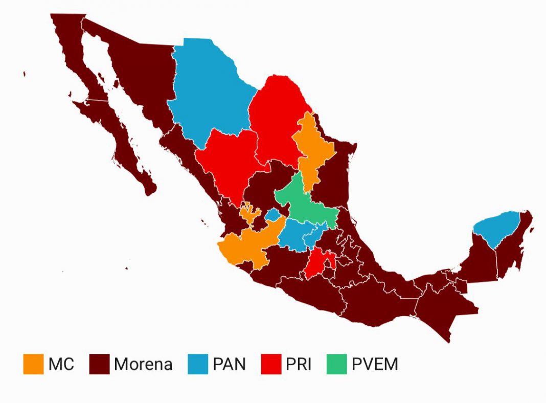De acuerdo con el Programa de Resultados Electorales Preliminares (PREP) del INE, Morena arrasó en 4 de los 6 estados con lo que queda demostrada su fortaleza al sumar hasta el momento 22 de las 32 entidades del país y aplastada la oposición.