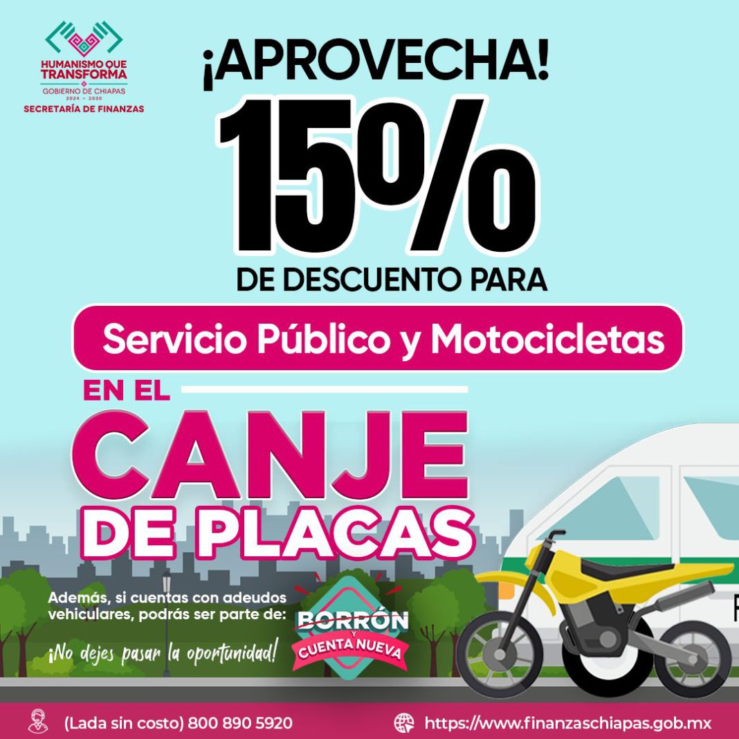Tuxtla Gutiérrez, Chiapas; 04 de marzo de 2025.- La Secretaría de Finanzas de Chiapas invita a todas y todos los motociclistas y conductores del servicio público a que acudan a los Centros de Recaudación Local a realizar el canje de placas y aprovechar el descuento del 15 % que estará vigente durante todo el mes de marzo.