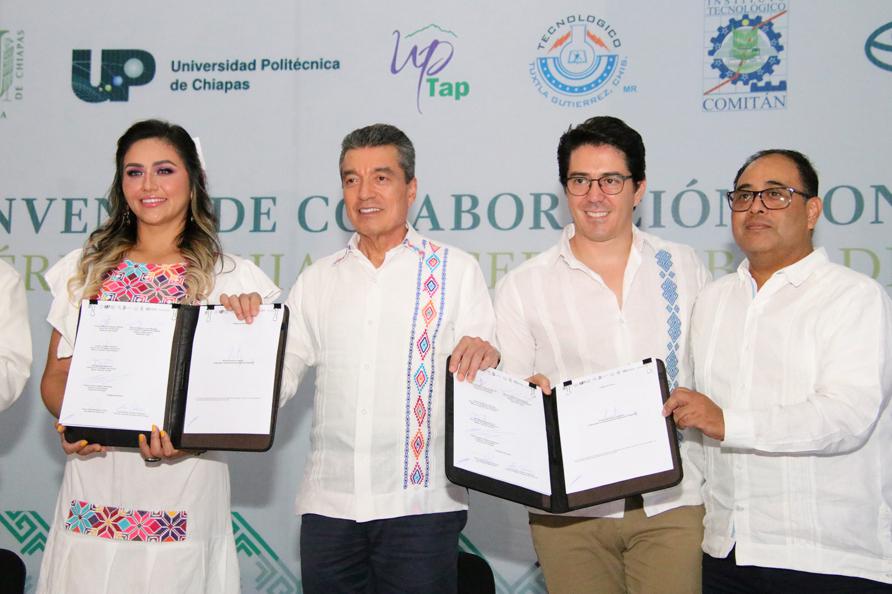 El gobernador Rutilio Escandón Cadenas atestiguó el Convenio de Colaboración entre Siemens Industry Software S.A. de C.V. y universidades públicas de Chiapas, con la finalidad de promover proyectos para el desarrollo de actividades tecnológicas entre las y los estudiantes y académicos, por lo que esta empresa realizó una aportación de 250 millones de pesos en programación de software e instrumentos de alto nivel tecnológico.