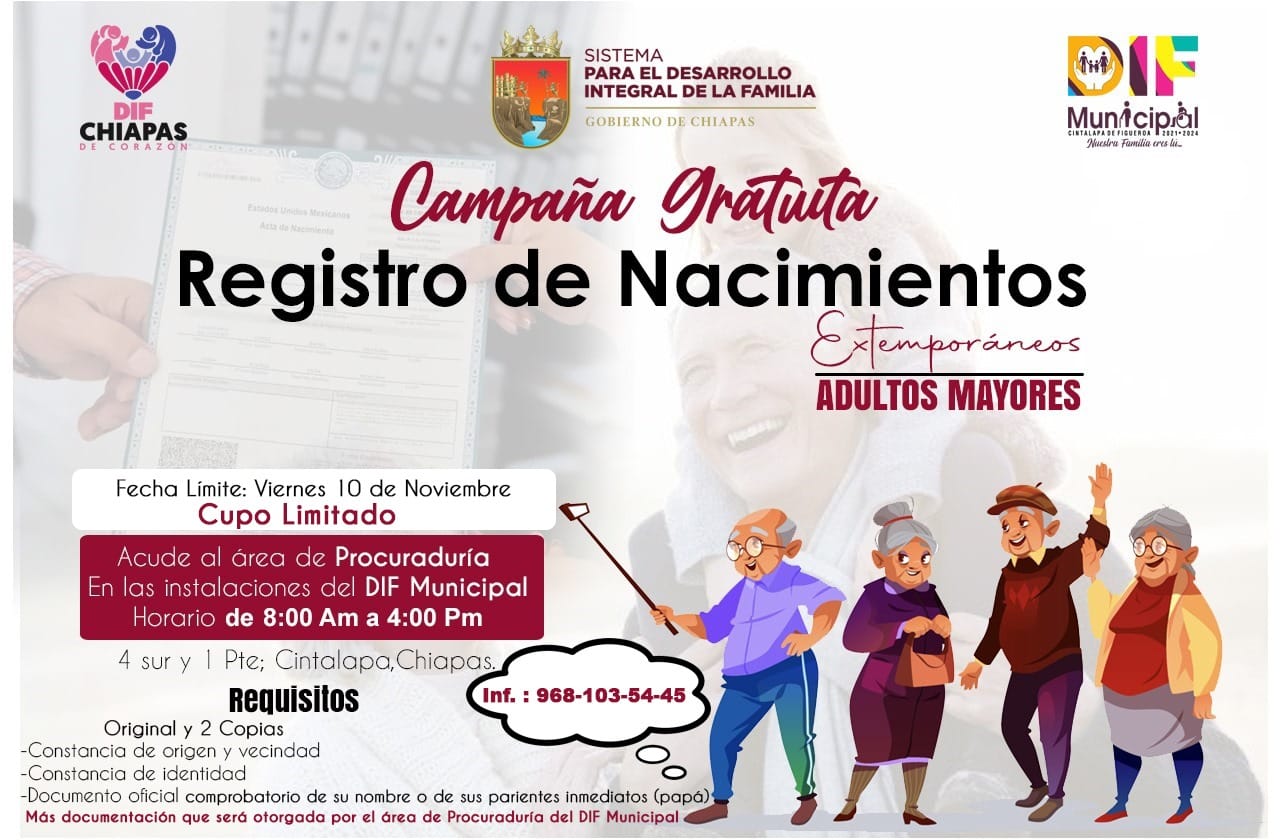 Cintalapa Campaña gratuita de registro de nacimientos extemporáneos By Cintalapanecos.com Nov 7, 2023 0 355 Share FacebookTwitterPinterestWhatsApp Noticias relacionadas Gobierno de Chiapas y DHL Express México signan Convenio de Colaboración Mar 3, 2026 Educar también es proteger: Mujer Segura llega a la Prepa 6 Mar 3, 2026 SAyBG y Semahn realizan reunión de trabajo para el seguimiento al Programa de Restauración y Saneamiento de Microcuencas en la Nueva ERA Mar 3, 2026 Pide SS aplicar segunda dosis de sarampión para completar esquema de protección Mar 3, 2026 Cintalapanecos.com El Sistema DIF Municipal de Cintalapa te invita a ser parte de la campaña gratuita de registro de nacimientos extemporáneos, consulta los requisitos en la siguiente imagen. Share FacebookTwitterPinterestWhatsApp Previous articleDesde SCLC, Rutilio Escandón pide atender medidas preventivas por lluvias y bajas temperaturasNext articleInvertimos para garantizar espacios educativos dignos, seguros, funcionales y de calidad: Rutilio Escandón - Advertisement - Más publicaciones Tecnológico Nacional de México Campus Cintalapa abre convocatoria para el semestre agosto–diciembre 2026 Feb 19, 2026 TecNM Campus Cintalapa realiza Foro “Mujer Tec en la Ciencia” Feb 12, 2026 Cintalapa; Inauguran Concurso municipal de la Vaca Lechera 2026 Feb 6, 2026 - Advertisement - Publicaciones recientes Congreso de Chiapas, de los primeros en aprobar la reducción de la jornada laboral Mar 1, 2026 Congreso realiza “Primer Parlamento de Mujeres Jóvenes Transformando a Chiapas” Feb 11, 2026 Comisión Permanente Convoca al Tercer Periodo Extraordinario de Sesiones Feb 11, 2026 Aprueba Congreso de Chiapas reforma a la Ley Federal de Armas de Fuego y Explosivos Feb 5, 2026 Conmemora Congreso el 109 aniversario de la promulgación de la Constitución Política de 1917 Feb 5, 2026