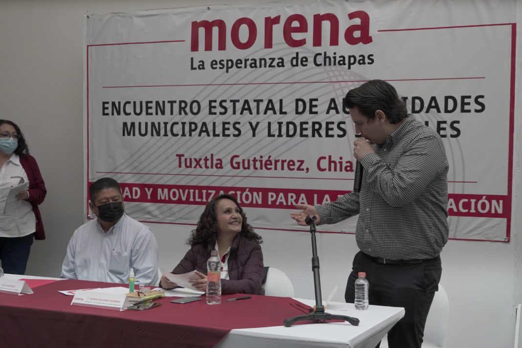 Tuxtla Gutiérrez, Chiapas.- En el marco de la agenda política que el partido Movimiento Regeneración Nacional (Morena) lleva a cabo este 2022, Carlos Molina, representante del CEN de Morena en Chiapas, acompañó a la delegada para Gobiernos Municipales, Dolores Padierna Luna, al Encuentro Estatal de Autoridades Municipales y Líderes Locales.