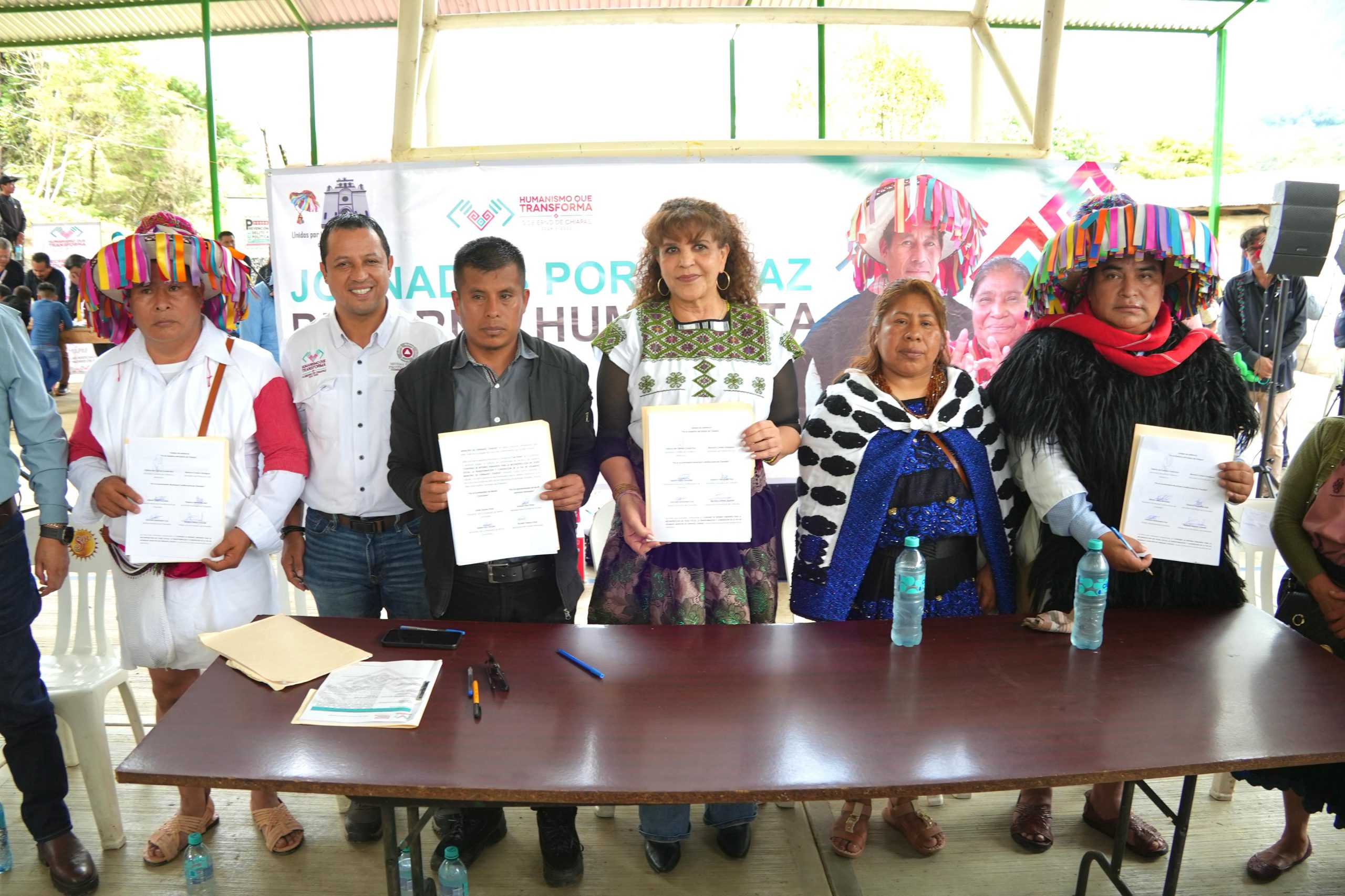 Representando a las familias retornadas, Enrique Díaz Pérez, María López Velasco, Silvia López Pérez, Candelaria Hernández Sántiz y Micaela Gómez Pérez compartieron su agradecimiento y esperanza por iniciar una nueva etapa de convivencia y desarrollo en paz.