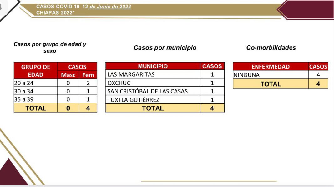 Tuxtla Gutiérrez, Chiapas; 12 de junio del 2022.- De acuerdo al último corte del panorama epidemiológico, Chiapas cierra el fin de semana con cuatro casos nuevos de COVID-19 en los municipios de Tuxtla Gutiérrez (1), San Cristóbal de Las Casas (1), Las Margaritas (1) y Oxchuc (1); se acumulan 82 días consecutivos sin registro de fallecimientos por esta enfermedad.