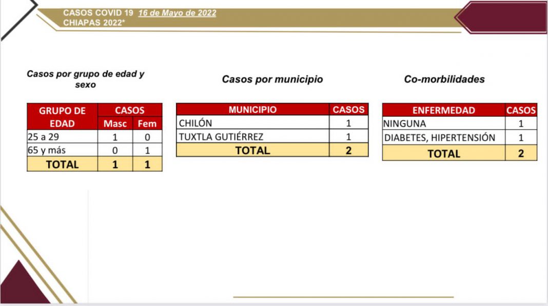 Tuxtla Gutiérrez, Chiapas; 16 de mayo del 2022.- De acuerdo a la incidencia de casos de COVID-19, Chiapas reporta en las últimas 24 horas sólo dos casos, uno en Tuxtla Gutiérrez y otro más en Chilón, sin registro de decesos por esta enfermedad.
