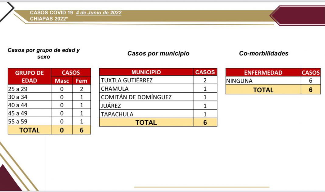 Tuxtla Gutiérrez, Chiapas; 04 de junio del 2022.- En las últimas 24 horas, la Secretaría de Salud del estado dio a conocer que Chiapas presentó seis casos positivos de COVID-19 en los municipios de Tuxtla Gutiérrez (2), Chamula (1), Comitán (1), Juárez (1) y Tapachula (1), registrando 74 días consecutivos sin decesos en la entidad por esta enfermedad.