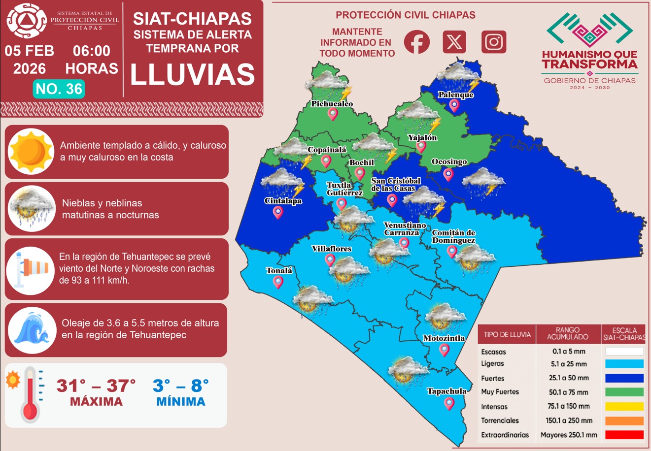 Hoy, 5 de febrero del 2026, el Sistema de Alerta Temprana por #Lluvias (#SIAT) de #ProtecciónCivil Chiapas emite el pronóstico de lluvias en nuestro estado. 🌧⛈️