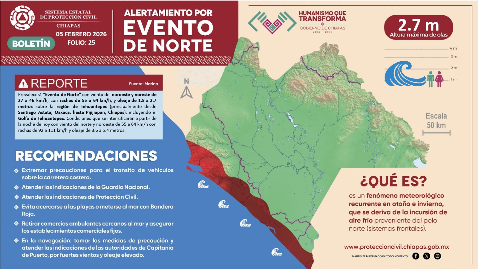 De igual forma prevalecerá evento de “Norte Fuerte”, con viento del noroeste y noreste de 27 a 46 km/h, con rachas de 55 a 64 km/h y oleaje de 1.8 a 2.7 metros sobre la región del Tehuantepec.