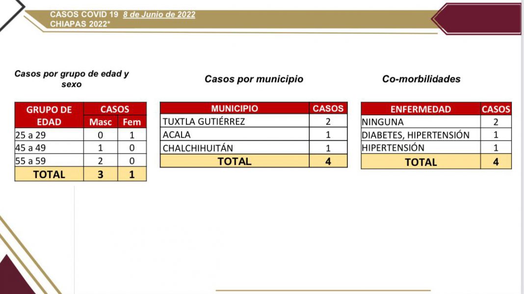 Tuxtla Gutiérrez, Chiapas; 08 de junio del 2022.- La Secretaría de Salud del estado informó que en las últimas 24 horas, Chiapas registró cuatro casos nuevos de COVID-19 en los municipios de Tuxtla Gutiérrez (2), Acala (1) y Chalchihuitán (1), sumando 78 días consecutivos sin presentar defunciones.