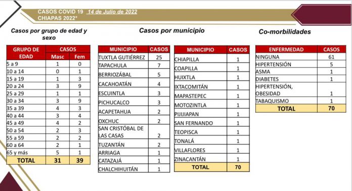 Tuxtla Gutiérrez, Chiapas; 14 de julio del 2022.- De acuerdo al último corte del panorama epidemiológico, Chiapas reportó 70 casos nuevos de COVID-19 en los municipios de Tuxtla Gutiérrez (25), Tapachula (7), Berriozábal (5), Cacahoatán (4), Escuintla (3), Pichucalco (39, Acapetahua (2), Oxchuc (2), San Cristóbal de Las Casas (2), Tuzantán (2), Arriaga (1), Catazajá (1), Chalchihuitán (1), Chiapilla (1), Coapilla (1), Huixtla (1), Ixtacomitán (1), Mapastepec (1), Motozintla (1), Pijijiapan (1), San Fernando (1), Teopisca (1), Tonalá (1), Villaflores (1) y Zinacantán (1); sin registro de defunciones por esta enfermedad respiratoria.