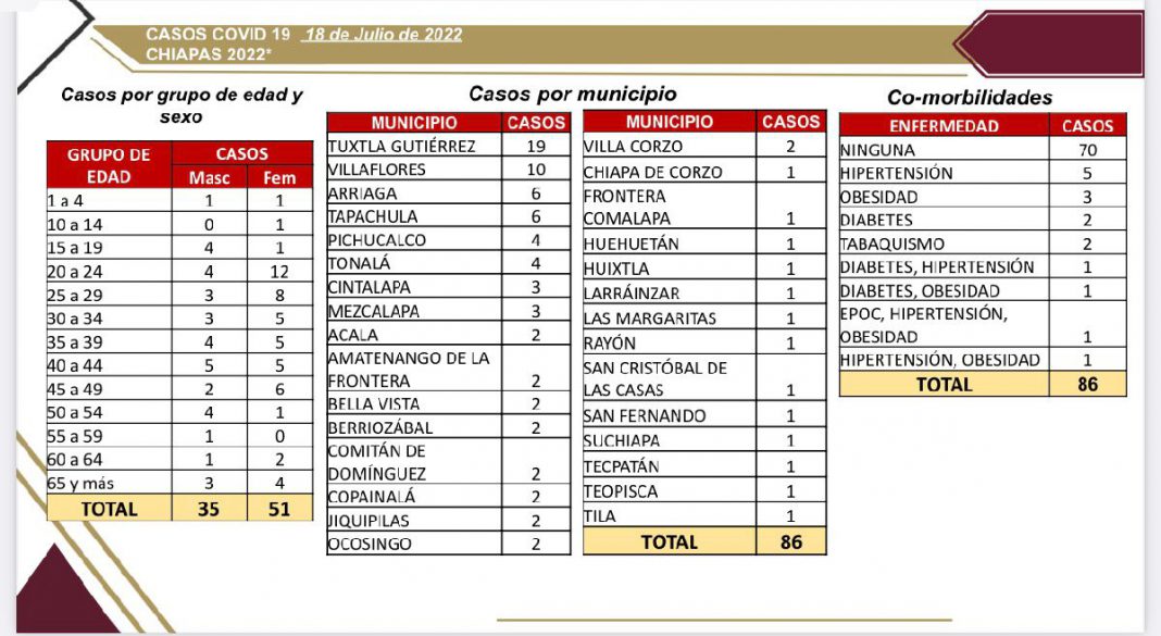 Tuxtla Gutiérrez, Chiapas; 18 de julio de 2022.- De acuerdo con el panorama epidemiológico COVID-19, la Secretaría de Salud del estado reporta este inicio de semana 86 casos positivos en la entidad.