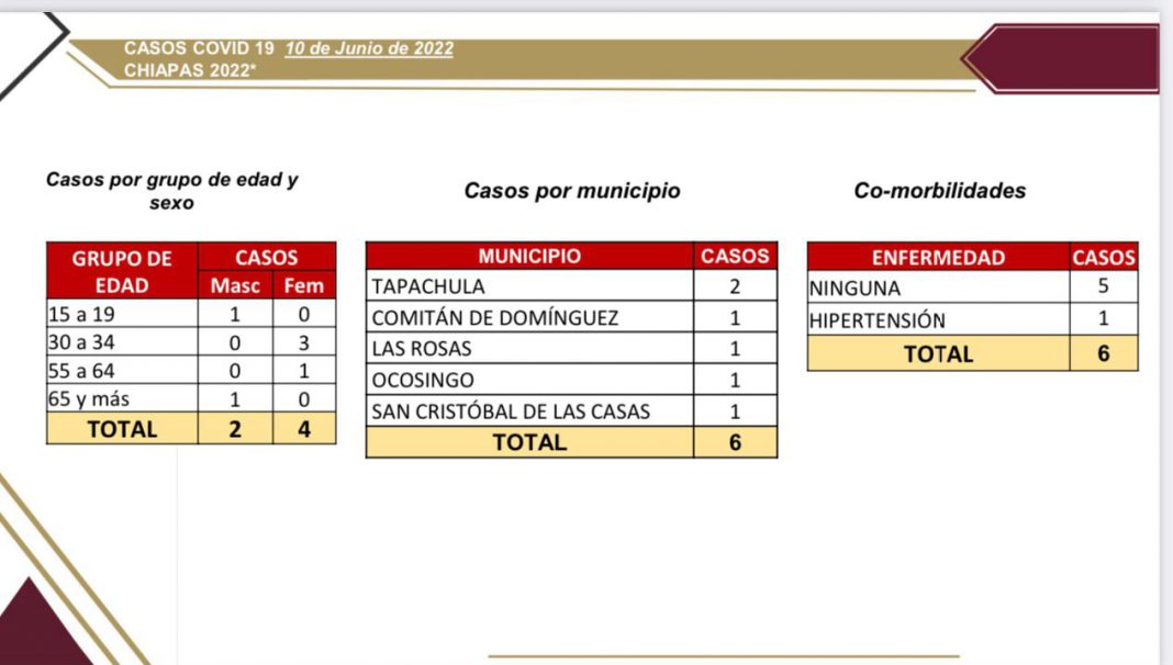 Tuxtla Gutiérrez, Chiapas; 10 de junio del 2022.- La Secretaría de Salud del estado, informó que en las últimas 24 horas Chiapas reportó seis casos nuevos de COVID-19 en los municipios de Tapachula (2), Comitán (1), Las Rosas (1), Ocosingo (1) y San Cristóbal de Las Casas (1), alcanzando 80 días consecutivos sin registrar muertes por esta enfermedad.