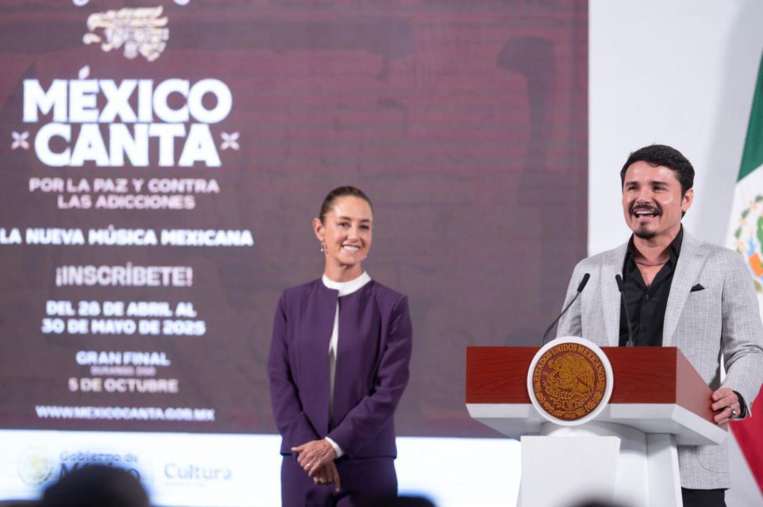 Ciudad de México, 07 de abril de 2025.- La Presidenta Claudia Sheinbaum Pardo convocó a jóvenes mexicanos y estadounidenses a participar en el concurso binacional de música México canta por la paz y contra las adicciones, —cuyas inscripciones serán del 28 de abril al 30 de mayo de 2025— y el cual tiene dos objetivos: promover la música mexicana sin contenidos que hagan apología a la violencia o a las drogas; y, como parte del Plan México, traer al país parte de la industria creativa de Estados Unidos.