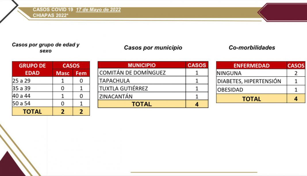 Tuxtla Gutiérrez, Chiapas; 17 de mayo del 2022.- En el panorama epidemiológico de las últimas 24 horas, Chiapas arrojó cuatro casos nuevos de COVID-19 en Tuxtla Gutiérrez, Tapachula, Comitán y Zinacantán, con un caso cada municipio, sin registro de ninguna defunción por esta enfermedad respiratoria, informó la Secretaría de Salud del estado.