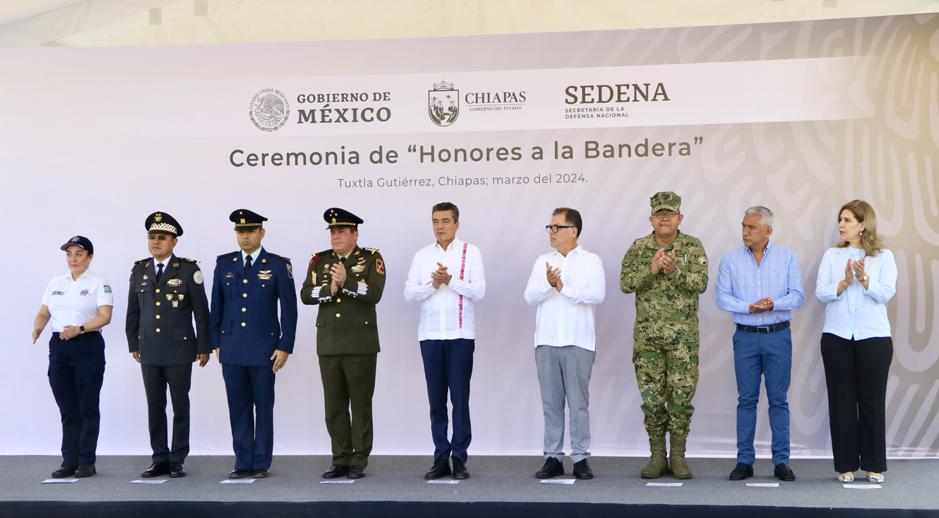 Este lunes se rindieron honores a la Bandera en la plaza central de Tuxtla Gutiérrez, donde el gobernador Rutilio Escandón destacó la importancia de promover los valores y principios cívicos, y honrar los símbolos patrios.