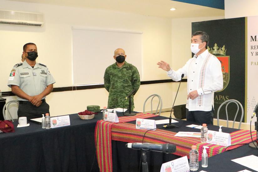 Estuvieron presentes: la secretaria general de Gobierno, Victoria Cecilia Flores Pérez; el secretario técnico de la Mesa de Coordinación de Construcción de Paz y Seguridad del Estado, José Francisco Trujillo Ochoa; el comandante de la 38 Zona Militar, Edwin Solórzano Barragán; los representantes de la 14 Zona Naval, Roberto Carlos Ávila Ramos y de la Coordinación Estatal de la Guardia Nacional en Chiapas, Rubén Salcedo Toledo.