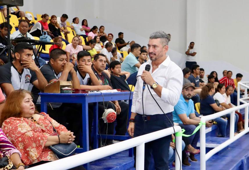 En su discurso, el titular del Indeporte indicó que, con la importante rehabilitación del Auditorio Municipal se motiva a niñas y niños de Huixtla a unirse a la liga local y ejercitarse.