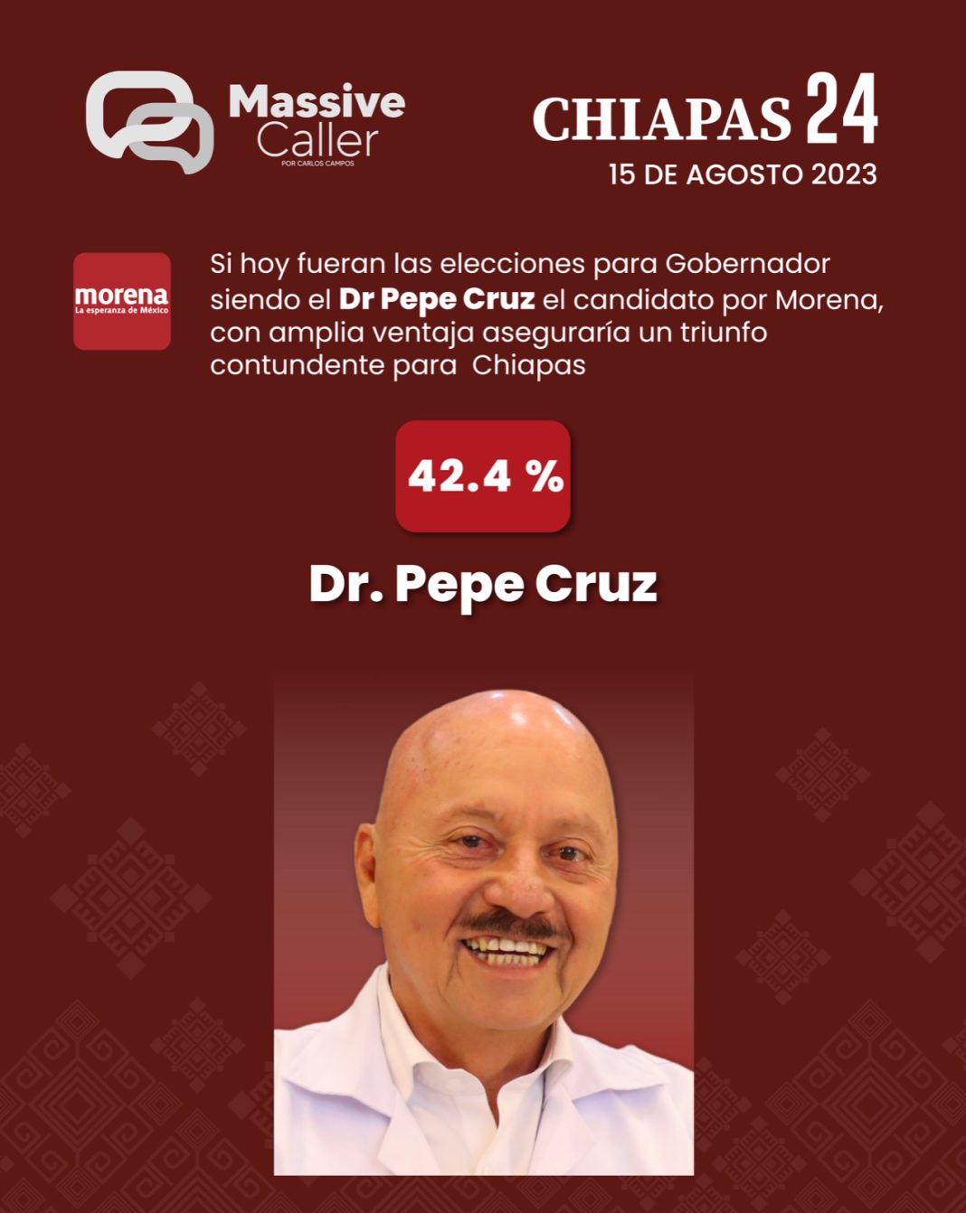 Tuxtla Gutiérrez, Chiapas.- De acuerdo con la última encuesta elaborada por la empresa Massive Caller, el doctor Pepe Cruz asegura de manera contundente el triunfo de Morena en las próximas elecciones para la Gubernatura de Chiapas, con más del 40 por ciento de votos de las y los chiapanecos.