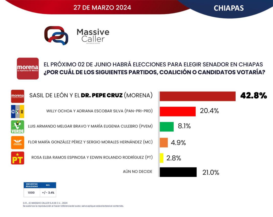 Tuxtla Gutiérrez, Chiapas; 02 de abril de 2024.- A dos meses de llevarse a cabo las elecciones para Senador 2024, el Dr. Pepe Cruz, candidato por Morena, aventaja con cerca del 43 por ciento en preferencia en la intención del voto, esto de acuerdo a datos de la encuesta emitida por la empresa Massive Caller.