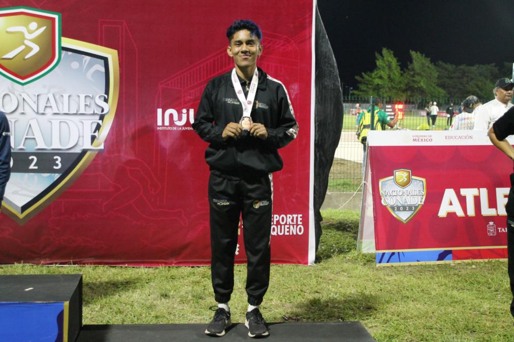 El pertegista, Eduardo Alonso Cameras Díaz, subió al pódium logrando adjudicarse la medalla de bronce al establecer un salto de 4 metros en la disciplina de Salto con Garrocha,  dentro de los Nacionales Conade 2023, justa que se está realizando sobre la pista de atletismo “Olimpia 21” en Villahermosa, Tabasco, sumando así nuestro estado la medalla número 73.