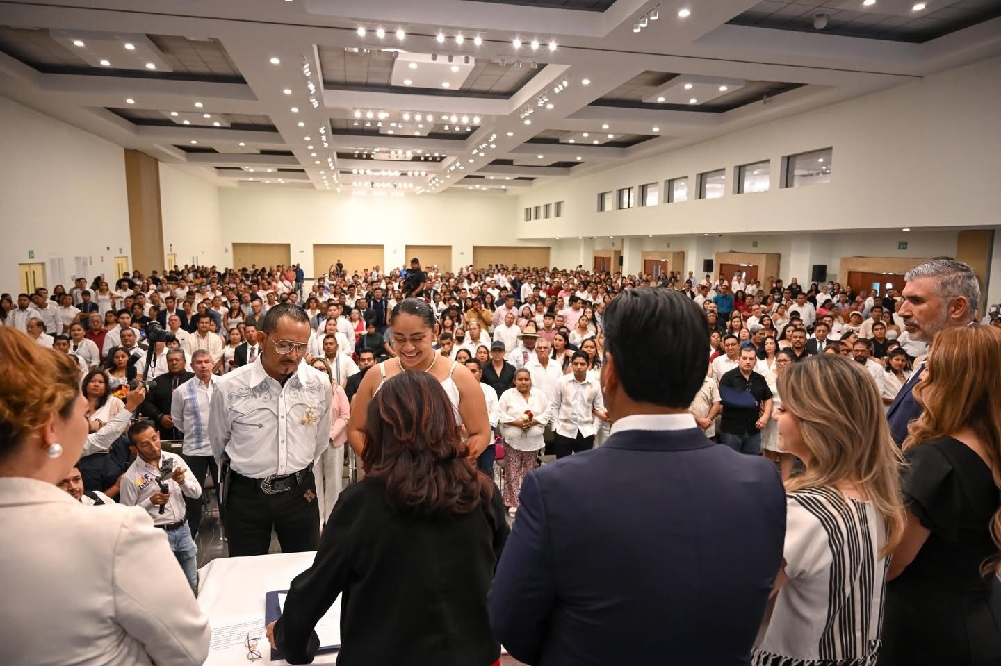 El gobernador Eduardo Ramírez Aguilar acompañó a la señora Sofía Espinoza Abarca a la celebración de Matrimonios Colectivos 2026, organizada por el Sistema DIF Chiapas. En este marco, felicitó a las 316 parejas que formalizaron jurídicamente su decisión de compartir la vida y las animó a construir una convivencia cimentada en el respeto, la tolerancia, la armonía y la solidaridad.