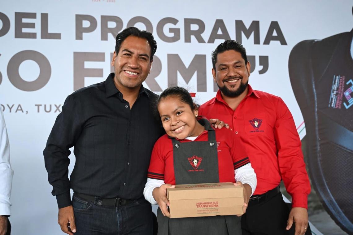 En la colonia Copoya, entregó 617 pares de tenis deportivos del programa A Paso Firme a alumnas y alumnos de la Escuela Primaria Lázaro Cárdenas del Río. Las risas, aplausos y felicidad de las y los niños contagiaron de emoción al mandatario, quien les explicó que esta iniciativa tiene como propósito apoyar la economía familiar y asegurar que cuenten con lo necesario para crecer con plenitud.