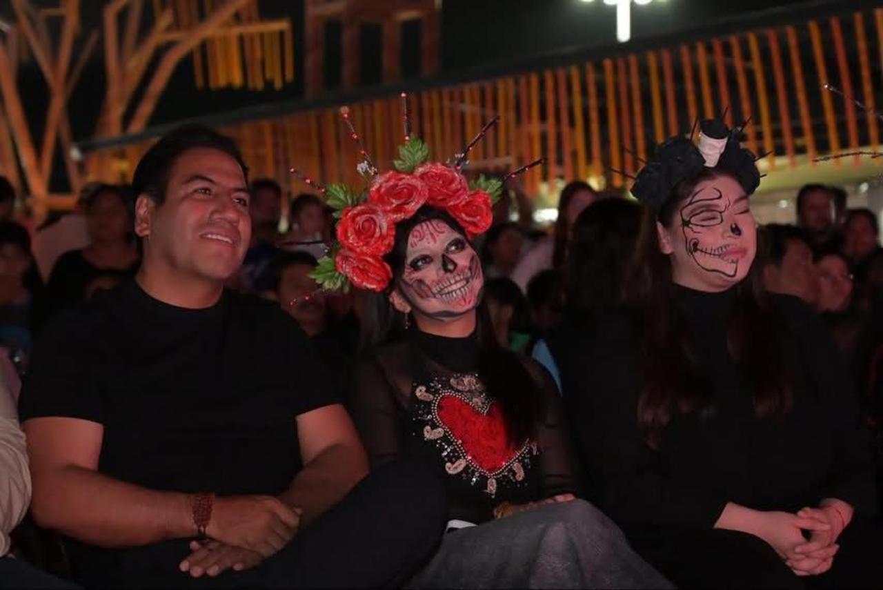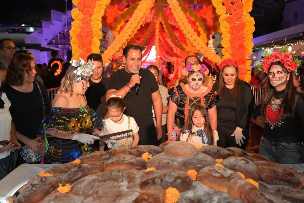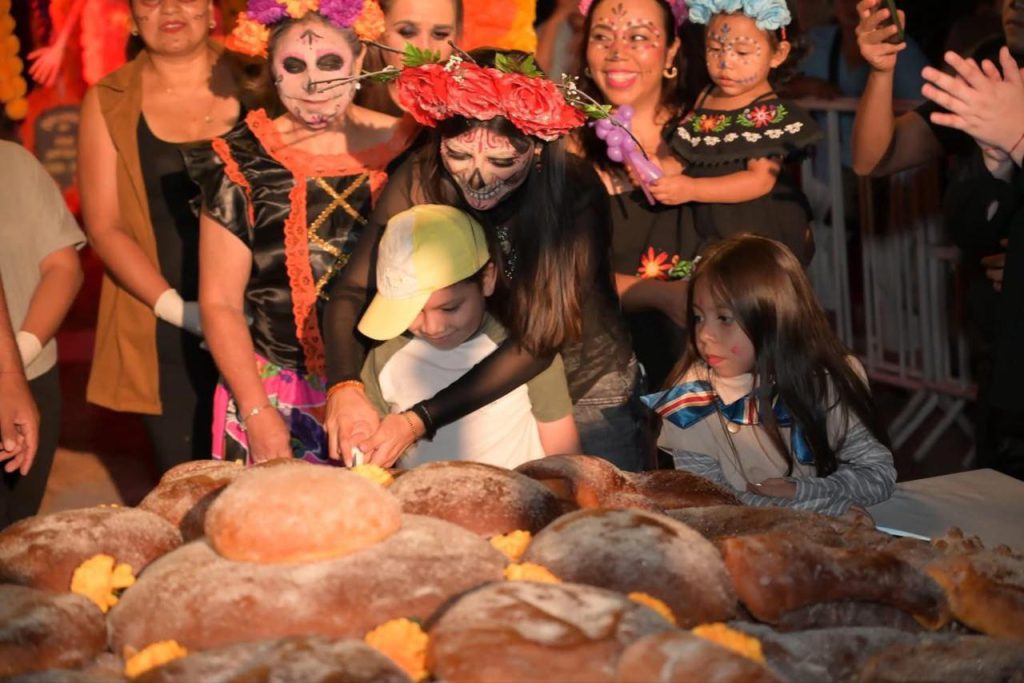 Rodeado de familias y personas de todas las edades, vestidas con trajes y disfraces alusivos al Día de Muertos, el gobernador Eduardo Ramírez Aguilar acompañó a su hija, Yazmín Ramírez Espinoza, en el tradicional corte del pan de muerto, como parte de las actividades del Festival Xibalbalam.