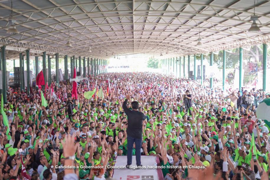 En medio de una fiesta en la que resonaban las letras “Y repican las maderas, se escucha el canto del Quetzal, ya vio venir la nueva era de la Chiapanequidad”, miles de personas acompañaron al candidato a gobernador por la coalición “Sigamos Haciendo Historia en Chiapas”, Eduardo Ramírez Aguilar, en su cierre de campaña electoral en el municipio de Tapachula.