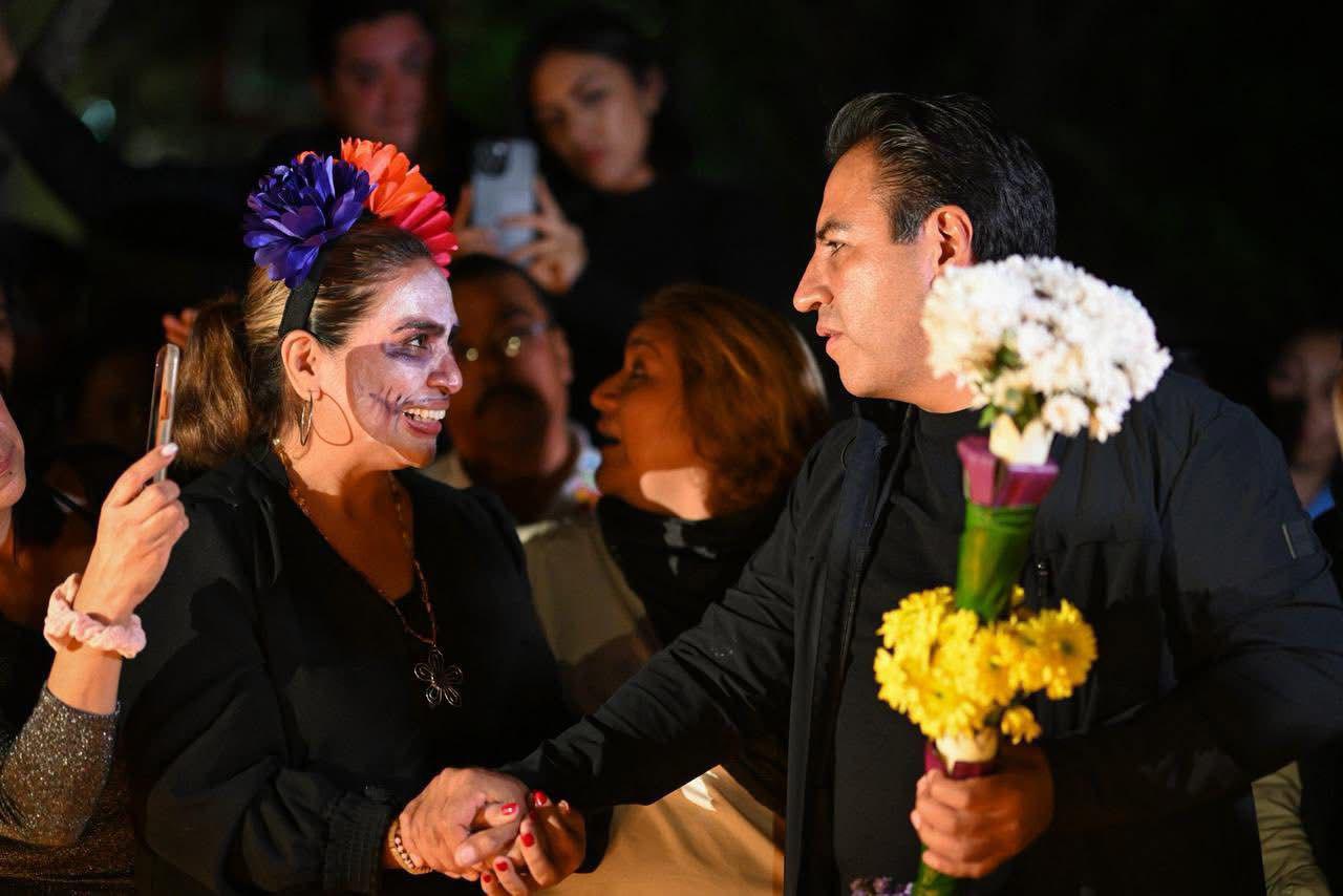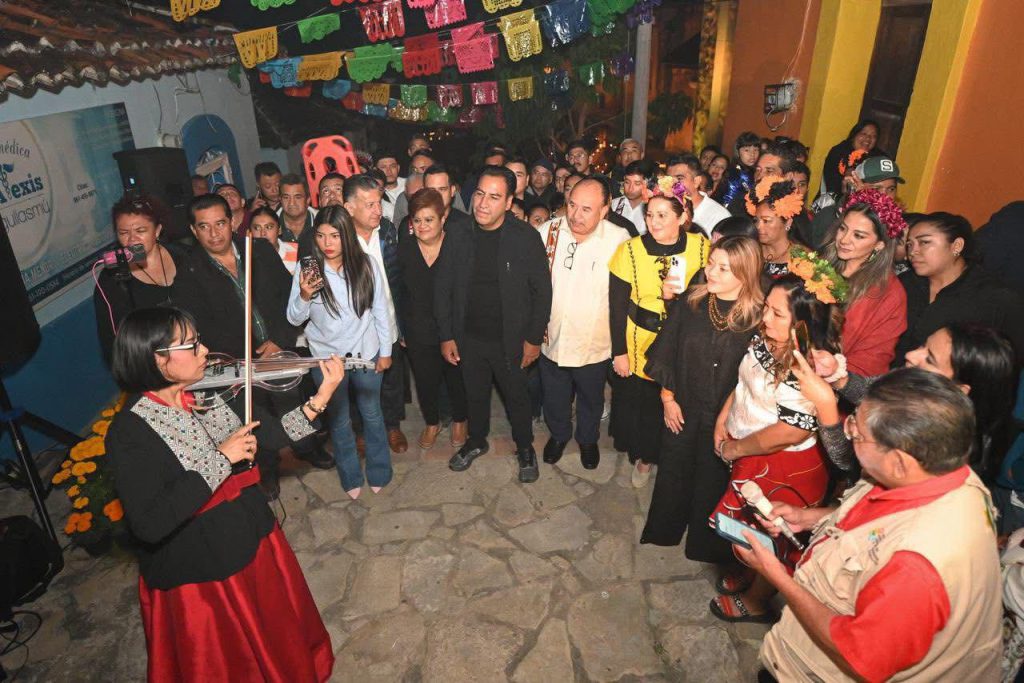 Entre música tradicional y rodeado de aromas y flores de cempasúchil, velas, pan artesanal, somés y otros platillos típicos, el mandatario, acompañado de su esposa Sofía Espinoza Abarca y su hija Yazmín Ramírez Espinoza, recorrió el recinto y visitó la tumba del profesor Luciano, recordado promotor cultural y de la gastronomía del municipio.