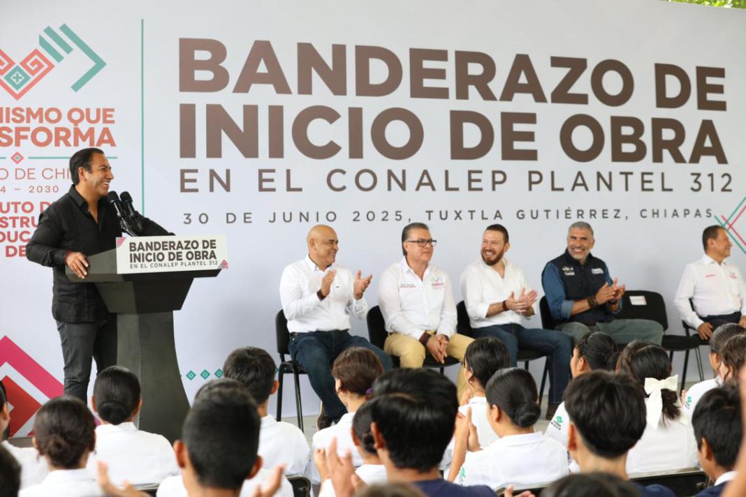 Durante el banderazo del inicio de obras de infraestructura educativa en el Colegio Nacional de Educación Profesional Técnica (Conalep) Plantel 312, de Tuxtla Gutiérrez, el gobernador Eduardo Ramírez Aguilar reafirmó su compromiso con la ampliación de espacios escolares y la dotación de herramientas tecnológicas que garanticen una mejor preparación académica para la juventud chiapaneca.